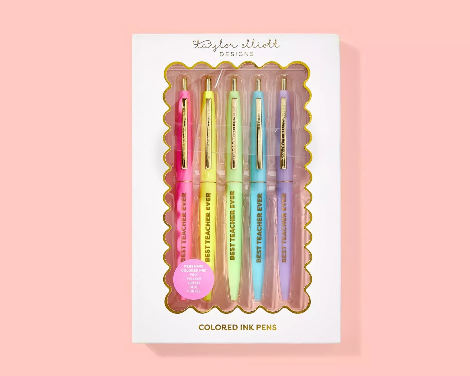 Make teachers feel special all year round with this perfect gift! Our medium ballpoint pen set comes with 5 fun colors, metallic gold foil details including the phrase "Best Teacher Ever" and super cute packaging! Pair this set with one of our notepads to make the gift even more special.