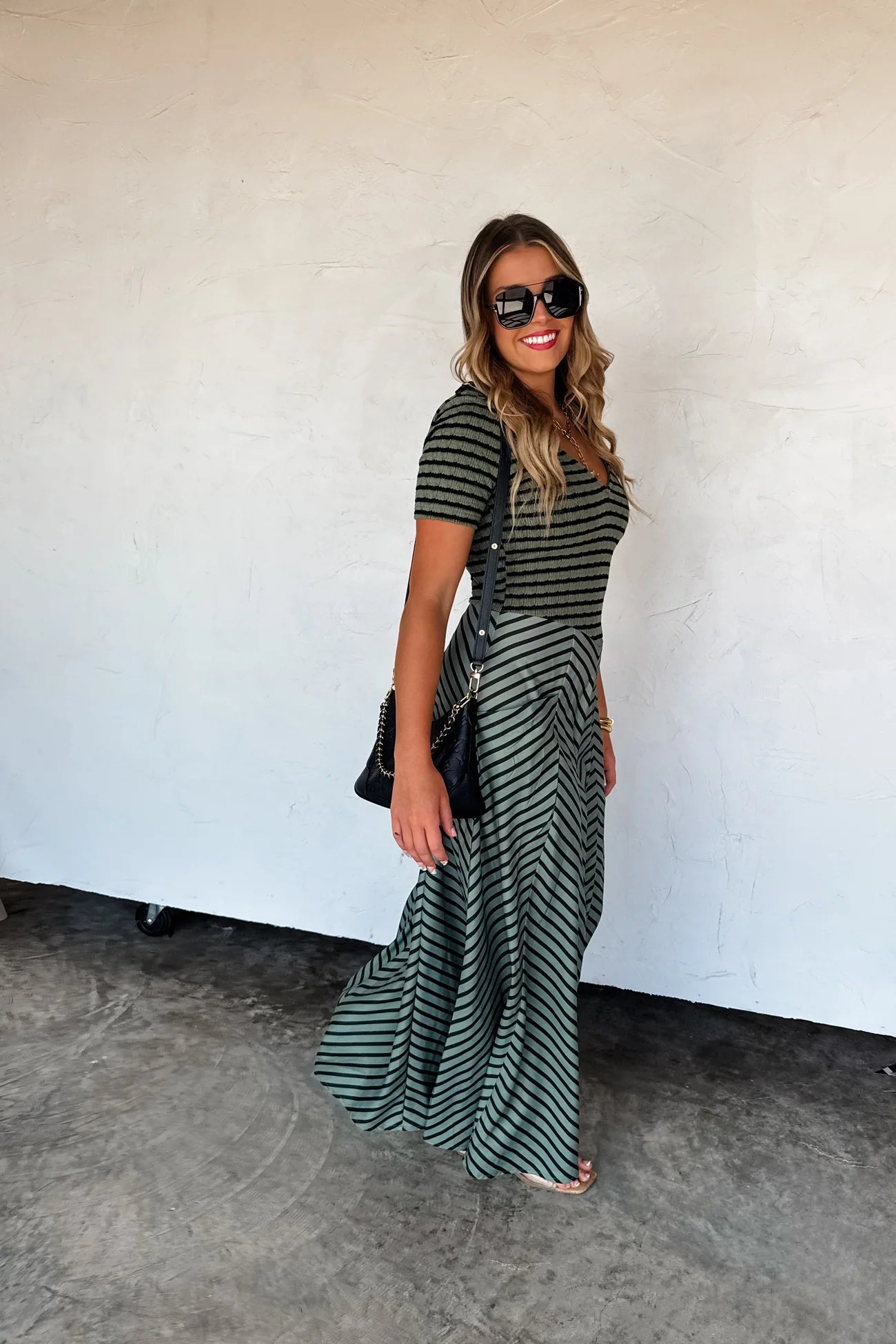 Get ready for fall with the Preorder Calisa Striped Dress, featuring a stretchy knit bodice and a flattering deep V neckline. The A-line skirt, crafted from slightly stretchy fabric, showcases angled stripe detailing and oversized side pockets for added style and function. Comfortable and versatile, this dress runs true to size and is perfect for the season's transitioning weather.