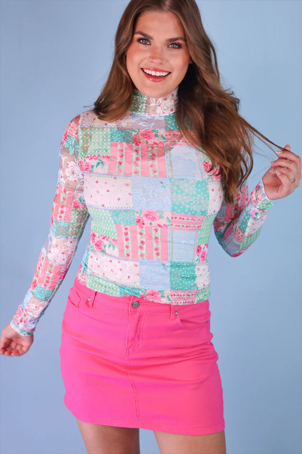 Embrace early spring with the Kylie Patch Heirloom Lace Top—a playful printed lace essential that brings feminine charm to every season. The fitted silhouette, long sleeves, and mock neck create a versatile piece perfect for layering or standalone wear. Light and effortlessly stylish, it's designed to brighten your wardrobe as the weather warms. Note: Runs smaller due to lace fabric; size up if between sizes.